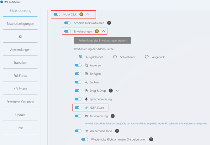 Aktiviere deine NUIA Click Erweiterungen und füge NUIA Spark hinzu: