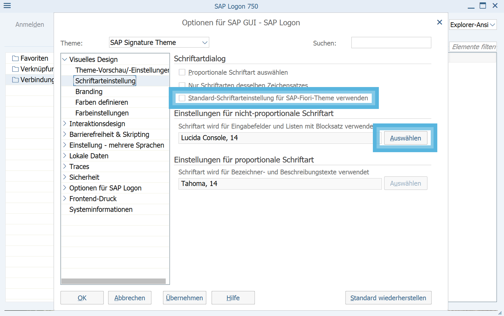 - Aktiviere die Checkbox bei "Standard-Schriftarteneinstellung für das SAP-Fiori-Theme verwenden".